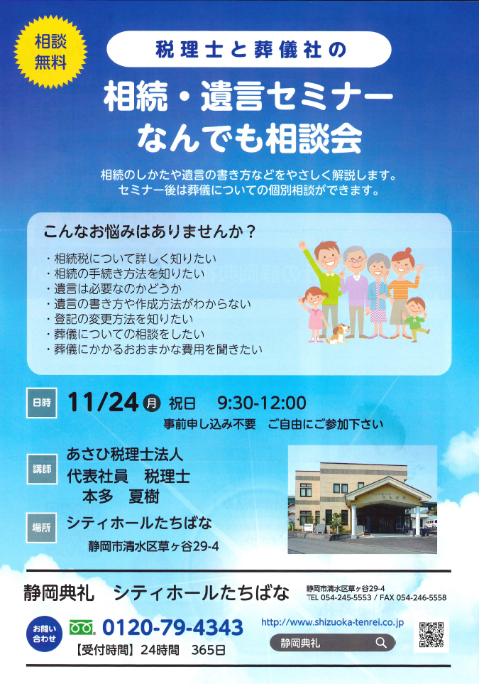 参加は 無料 です。なかなか聞けない「相続」の事、是非お気軽にご参加ください。